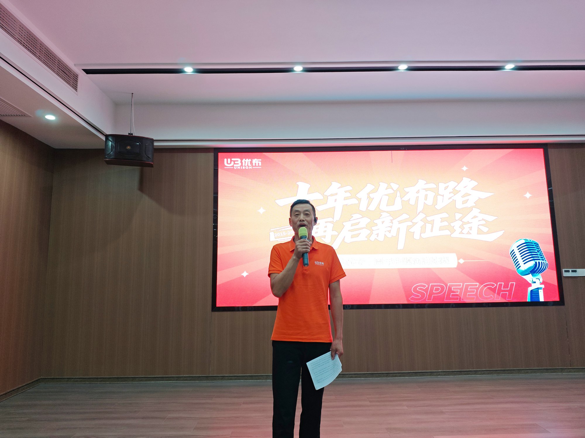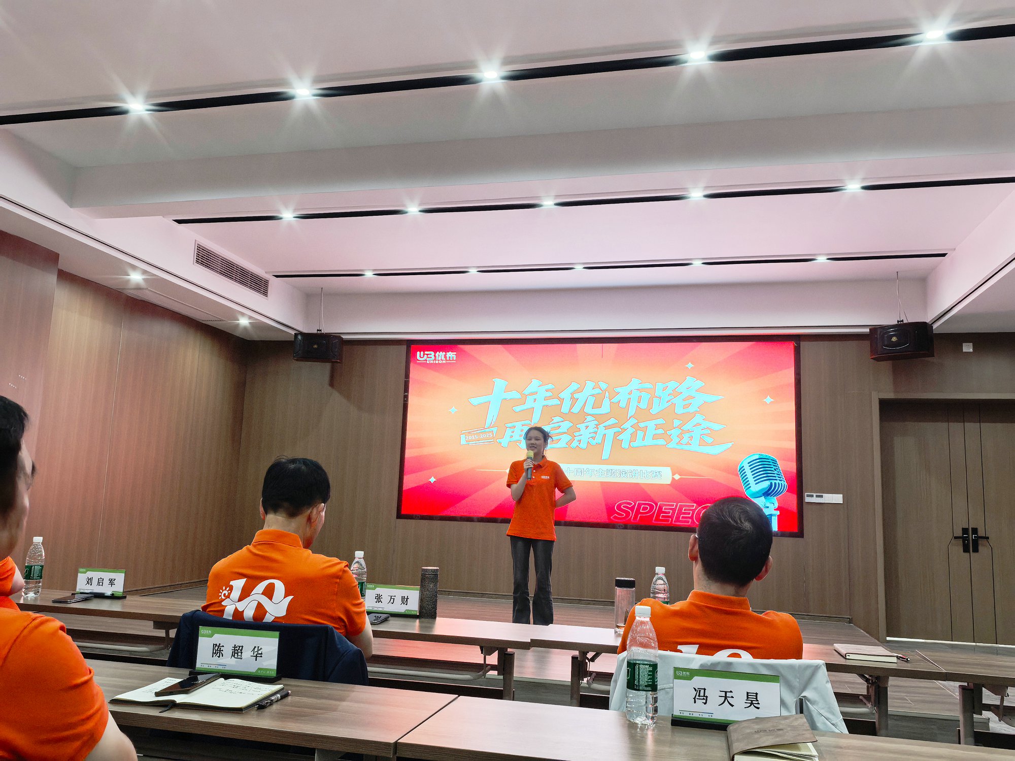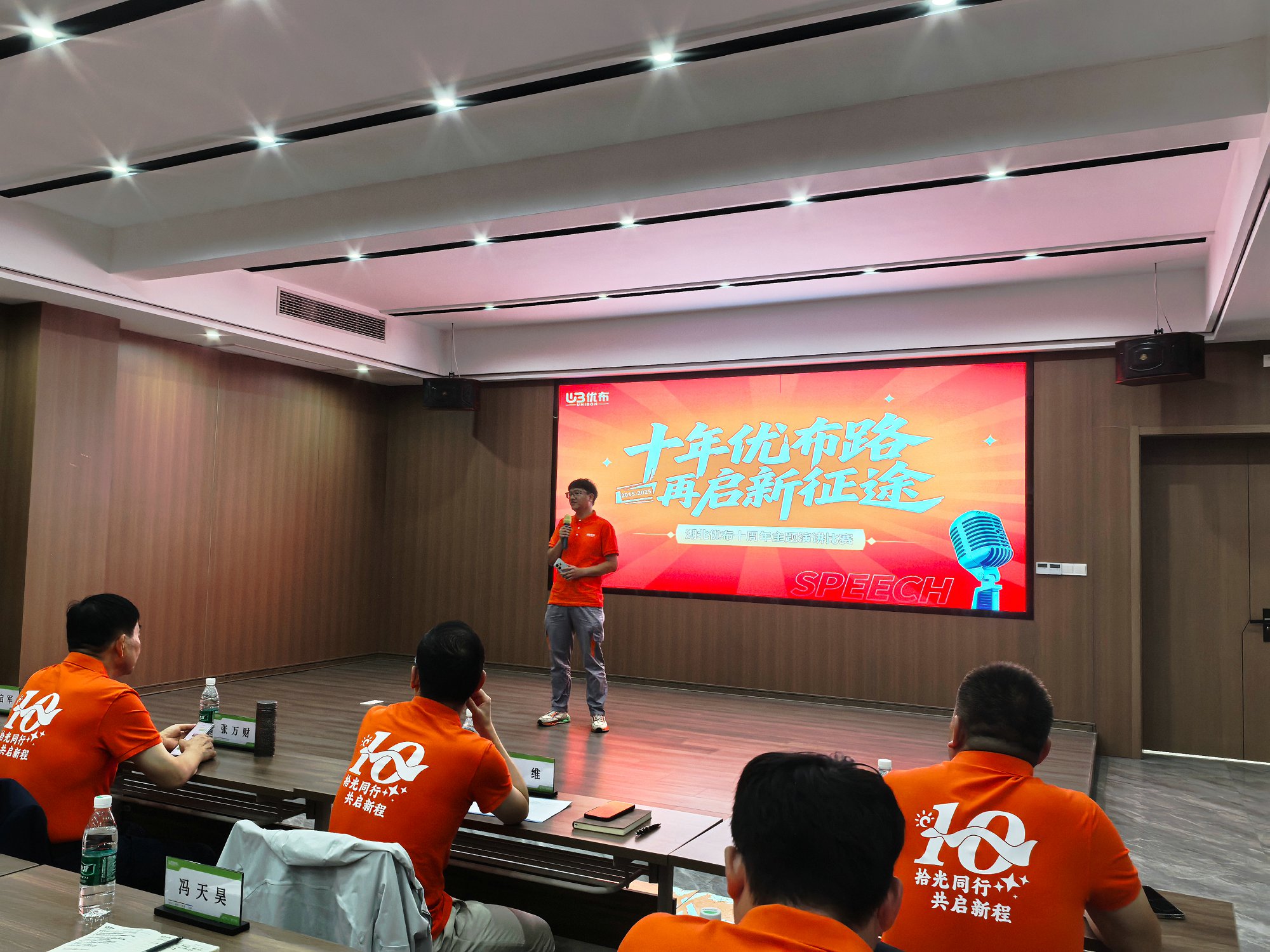 17名选手按抽签顺序依次登台,围绕主题展开5-8分钟的主题演讲。新老员工的故事交织,完美诠释了优布文化的传承与新生。他们脱稿演讲,情感真挚,展现了优布人自信昂扬的风采。司龄漫长的老员工们,讲述的是与优布共同成长的青春。他们分享了许多不为人知的创业细节和发展中的关键瞬间,将十年的奋斗历程、团队的情谊以及对公司的深厚感情娓娓道来。他们的故事里,是沉淀下来的热爱与坚定不移的归属感,深深打动了在场的每一位听众。